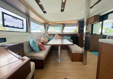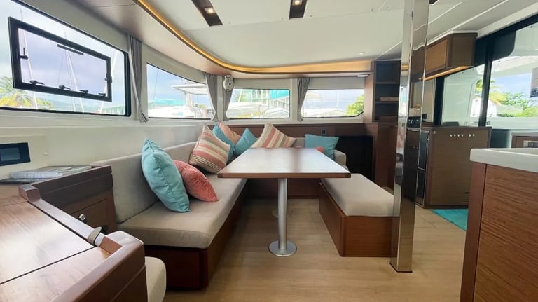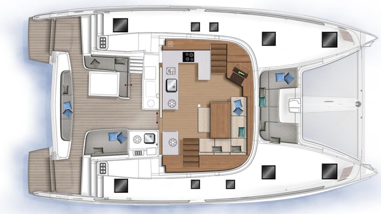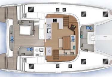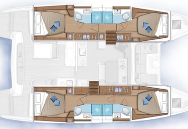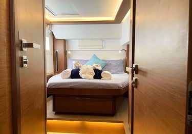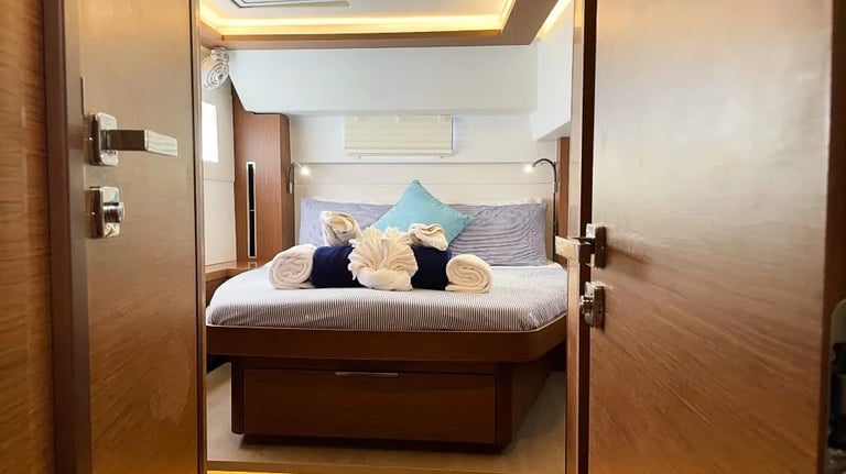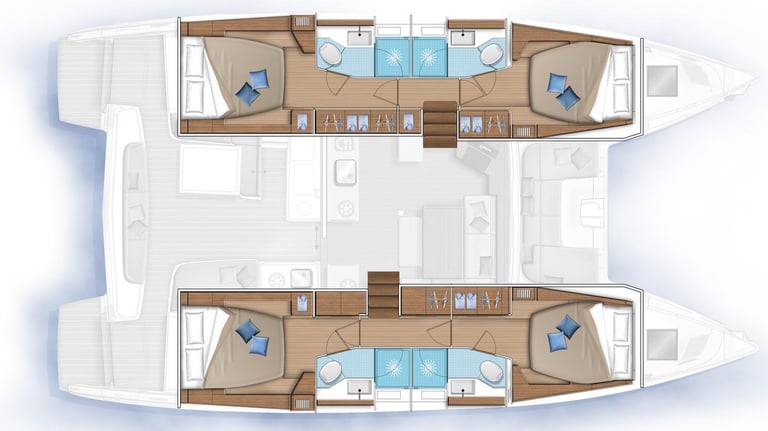 Four spacious cabins, each featuring a comfortable queen bed, private en-suite bathroom with shower, sink, and toilet, as well as ample closet and storage space.