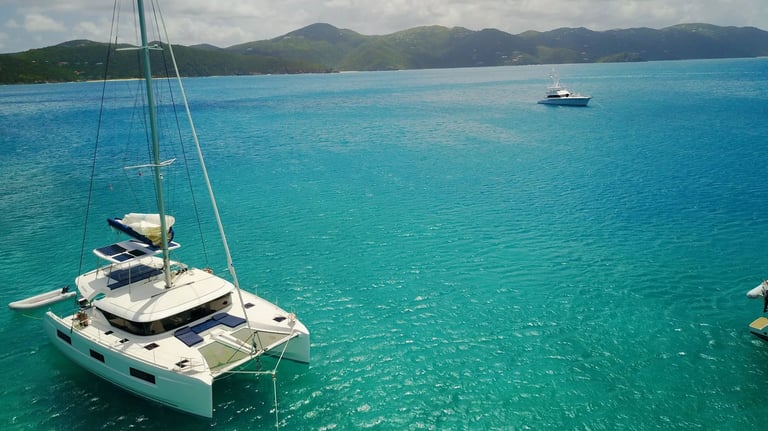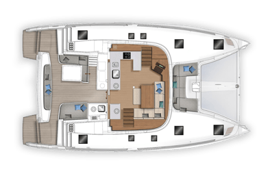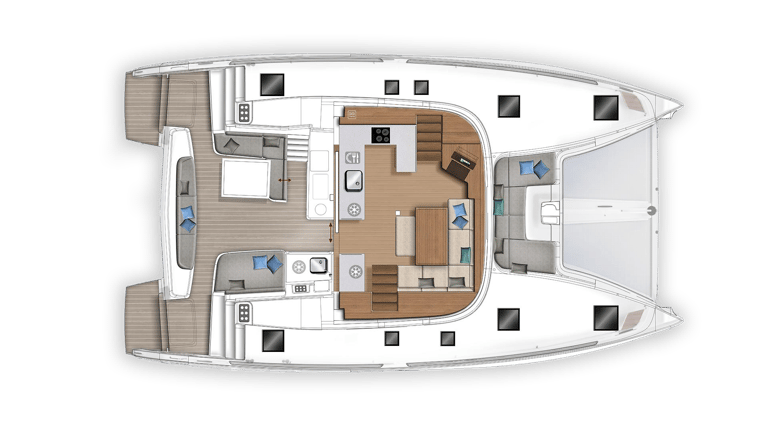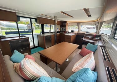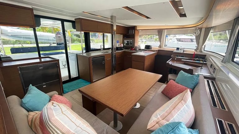 Comfortable salon with panoramic windows, a convertible dining area, and direct access to the cockpit. The galley is fully equipped for meal preparation and includes a refrigerator, stove, air fryer, and extensive storage space.