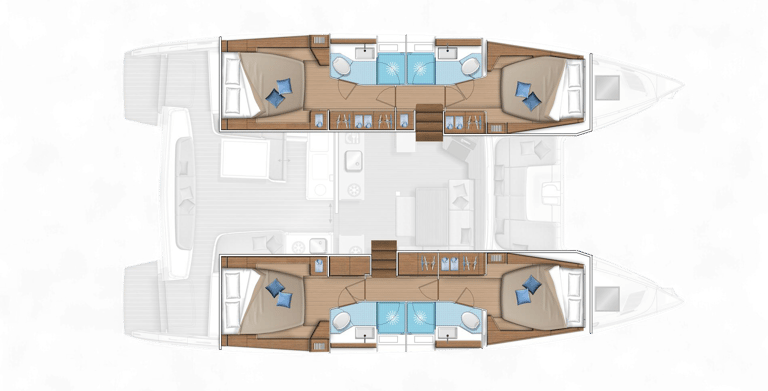 Four spacious cabins, each including a comfortable queen bed, private en-suite bathroom with shower, sink, and toilet, as well as ample closet and storage space.