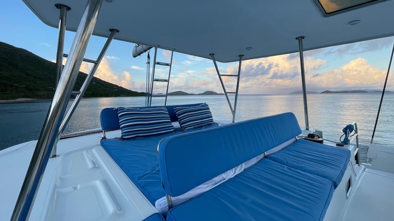 Double-access flybridge featuring an elevated helm station with full navigation controls and cushioned sun sofas.
